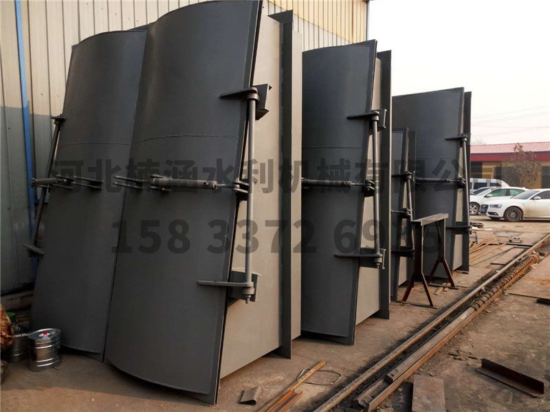 節(jié)能型側(cè)開式拍門由門板、門鉸、門座和密封件等組成。門板通過門鉸安裝在門座上,根據(jù)國內(nèi)泵站的應用情況,拍門的門形圓形和矩形兩種。一般出水管口徑小于、等于2m的(即口徑1.6的泵)用圓形拍門,大于該口徑的用矩形拍門。
