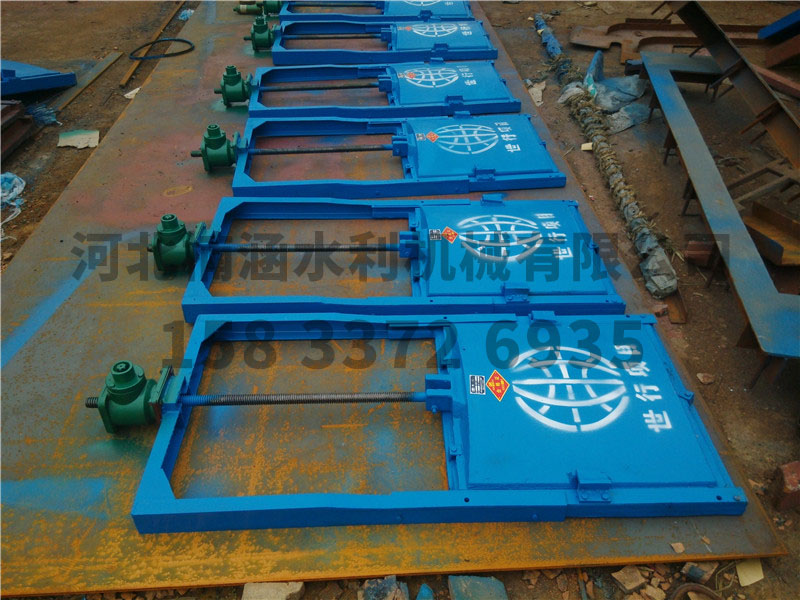 臺(tái),安裝方便。小規(guī)格的采用整體鑄造,較大規(guī)格采用組裝式。訂貨時(shí)詳細(xì)注明閘門(mén)尺寸、