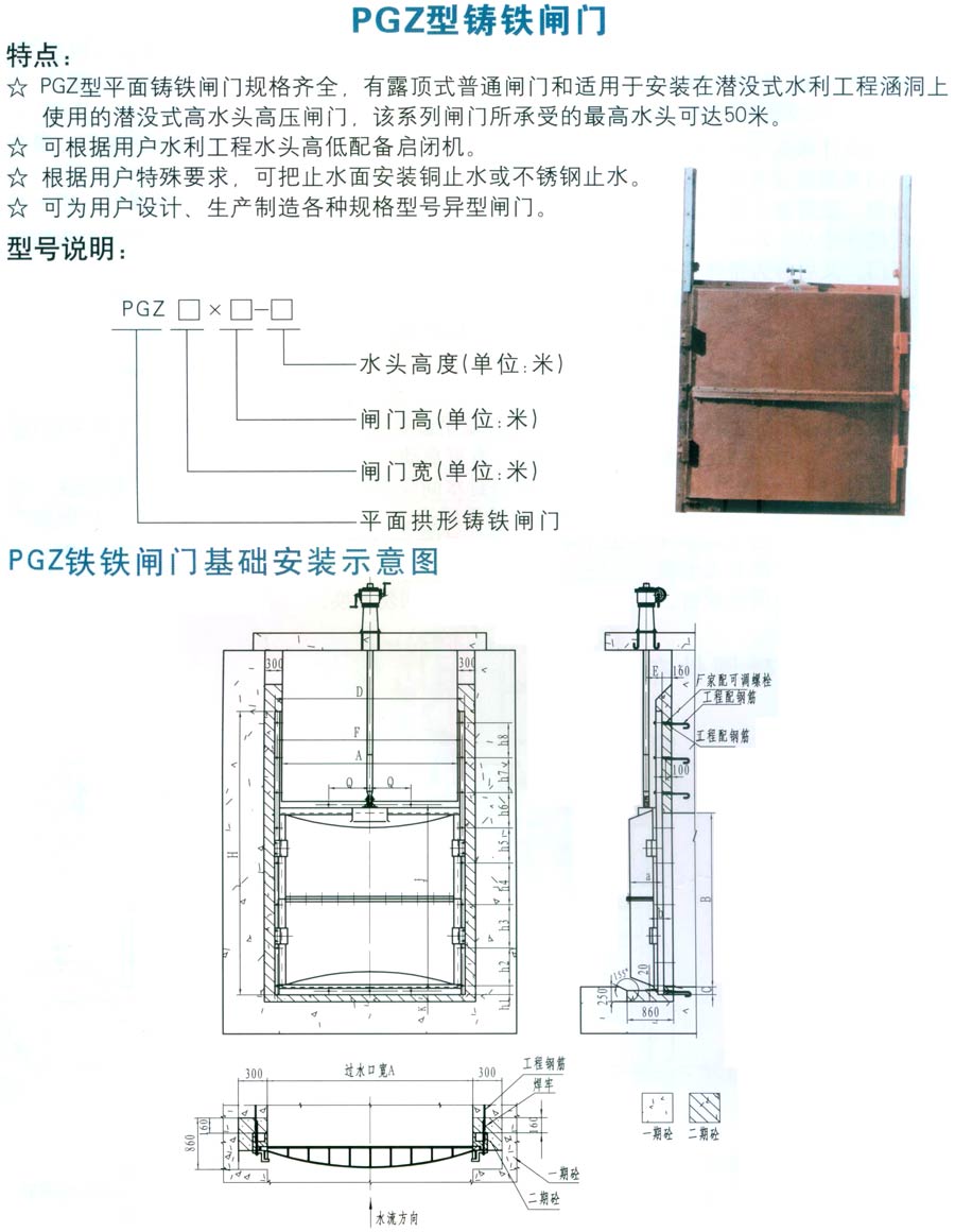 PGZ型(普通、高壓)鑄鐵閘門外形及基礎(chǔ)安裝參數(shù)表