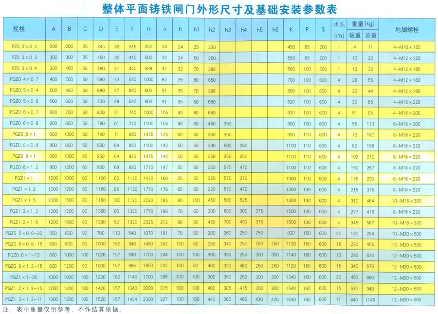 整體平面鑄鐵閘門外形尺寸及基礎參數(shù)表